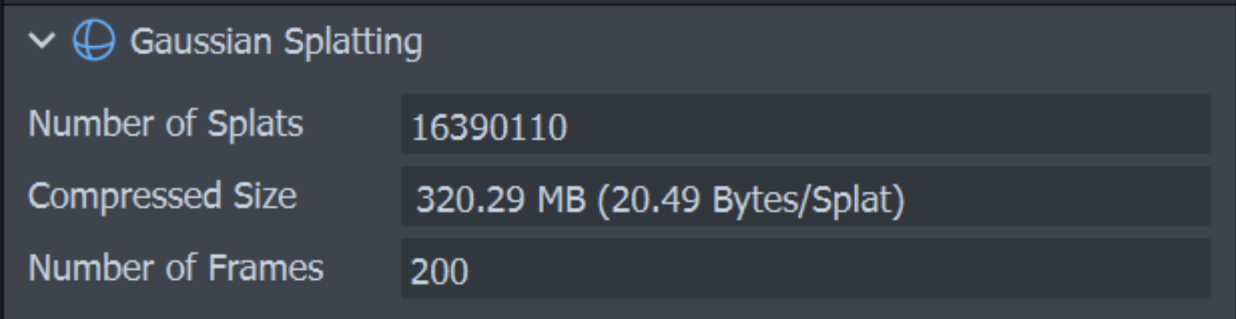 You can see the number of splats, and size that the compressed Gaussian Splatting asset file takes up inside the Lens, in the Inspector panel when your asset is selected.