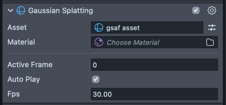 When a GS visual component has a GSAF asset attached, a few additional fields appear: Active Frame to indicate the current active frame number for this Gaussian splatting animation file as seen on the image below. Auto Play check to automatically load the visual in play mode FPS Animation speed in Frames Per Second