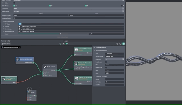 After that, go ahead and make a Multiply node in between and follow up with a Float Parameter node named "Factor" which will become our thickness controller. You will find that when dragging the slider to the right, roots actually get thinner, the functionality is there but the logic is not what people are used to. We always want to make our UI user friendly! In this case dropping in a One Minus node can flip the result, so when the Factor number gets larger our mesh will go thicker:
