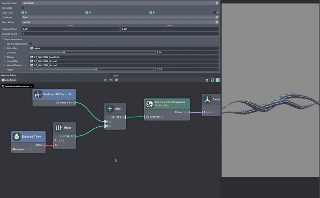 What if we use this black and white information to control how much we scale our roots? Drop in a Swizzle node after “Alpha” Texture 2D Parameter. We can get just the alpha channel out by typing in "a" in the Swizzle field. If an image is packed with different information in each RGBA channels, both the Swizzle and Split nodes can come in handy to extract each channel.