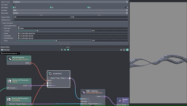 What more fun nodes can we can throw in here? Let's create a Conditional node, connect the swizzled alpha texture into True and Albedo into False, then make a Bool Parameter and give it a good name. This will become a checkbox for us to view two different textures with one click.