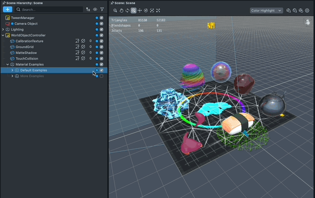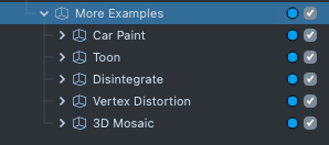 To see the other example you can simply disable the Default Example object and enable the More Example scene object by pressing the checkbox next to the object’s name in the Scene Hierarchy panel.