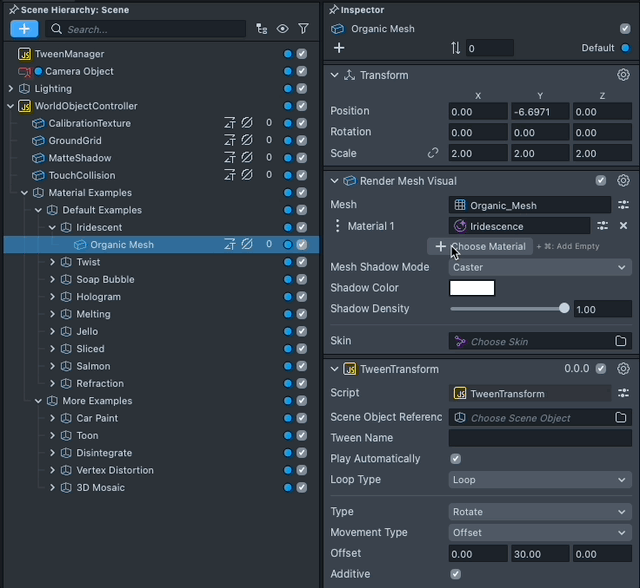 Each material has options that you can easily tweak. You can select an object, and click on the Settings icon next to the Material field to find some of the material's setting. Then, click on the Open Full Inspector button to see all the settings of the material.