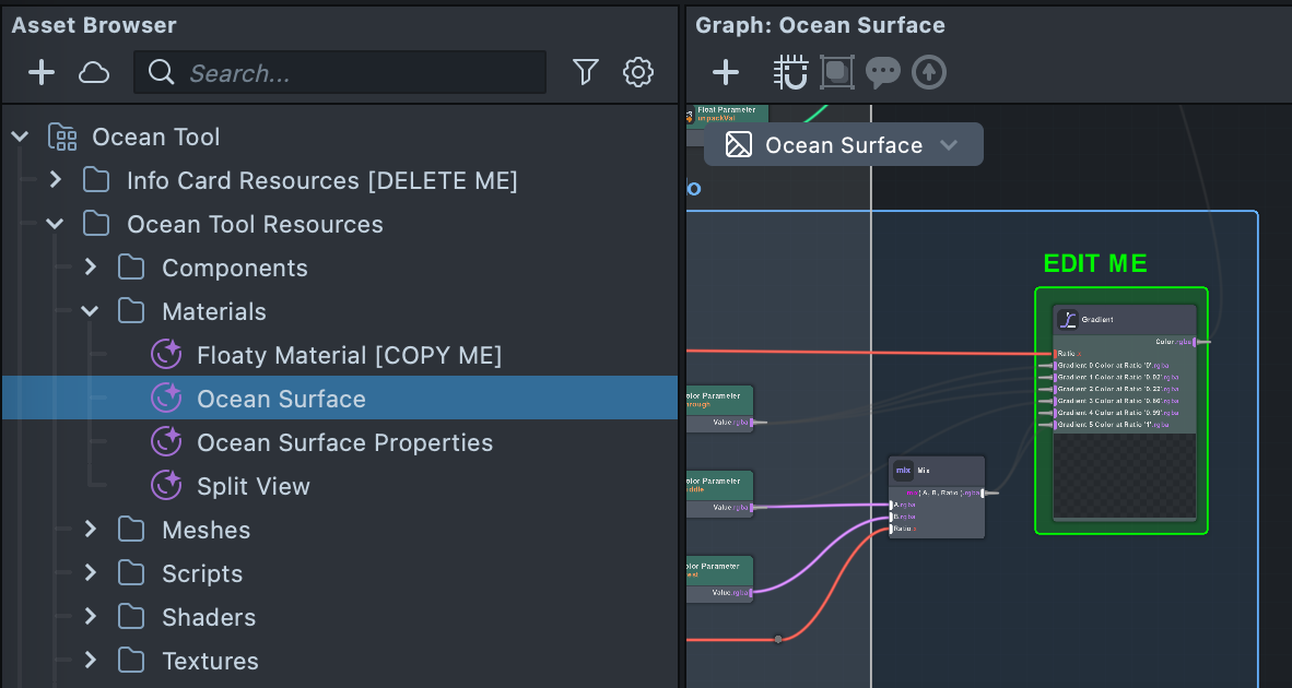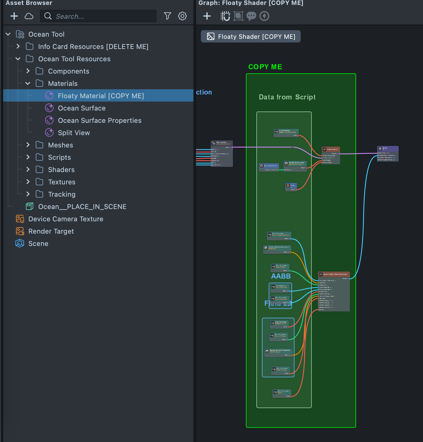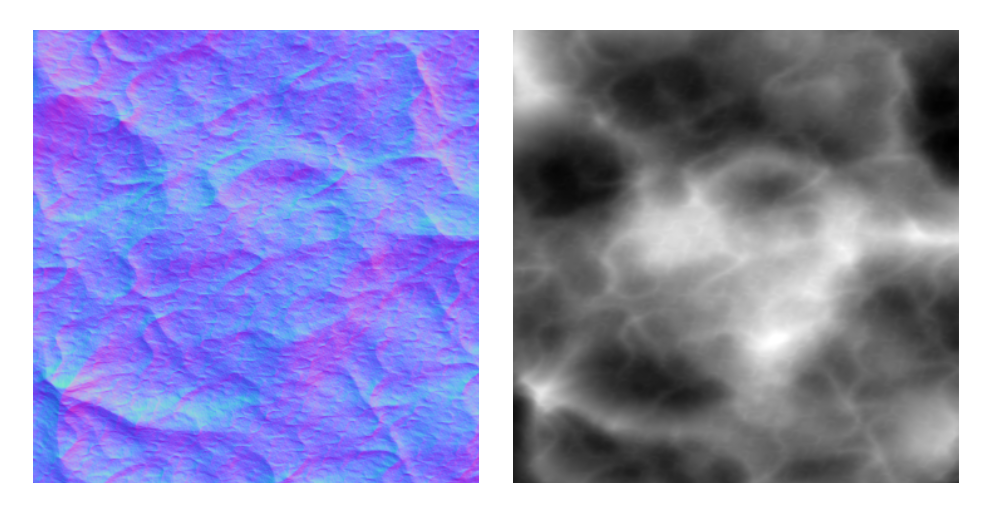 Ocean Surface Propertiesmaterial creates a noise and normal texture and draws them to theOcean NormalandOcean Heightmaprender targets. WhenTouch Inputis enabled under the Ocean Tool script, an additional fluid normal texture is also applied to theOcean Normalrender target.