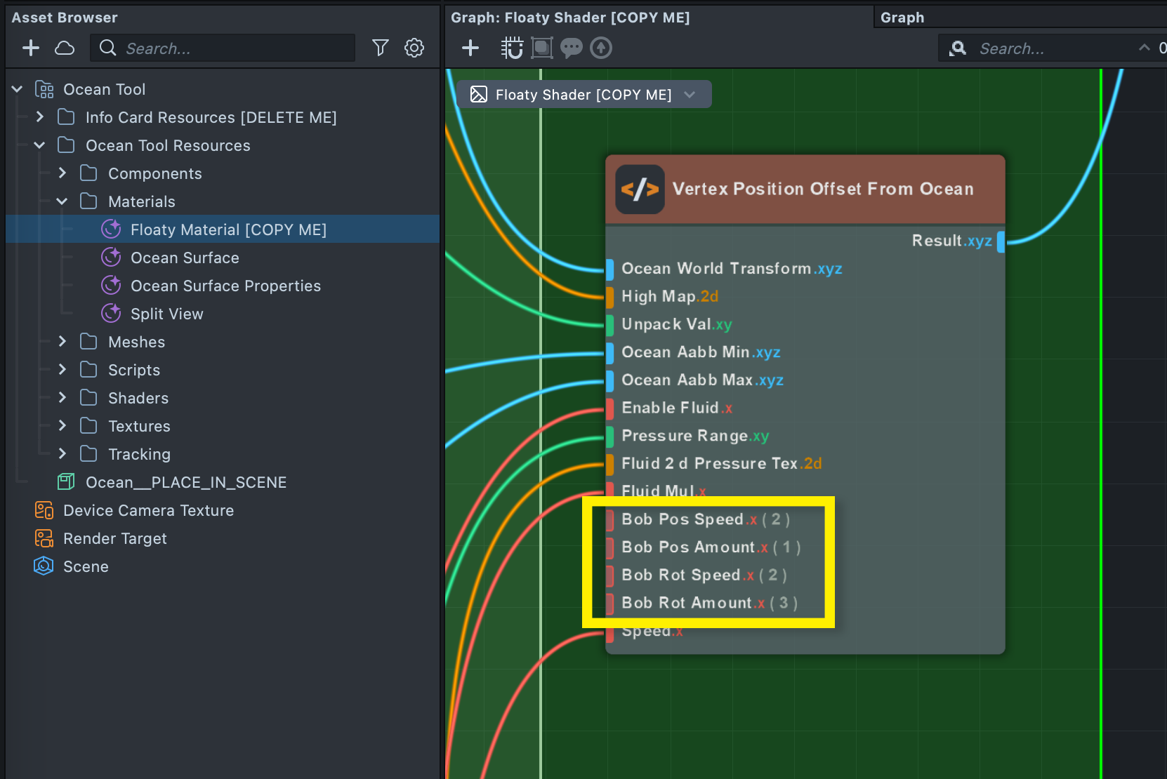 | Float Objects | Objects For Float | The script sets material parameters to objects assigned below to control their vertex position, it offsets the position based on wave height at where the object is in space. | ||