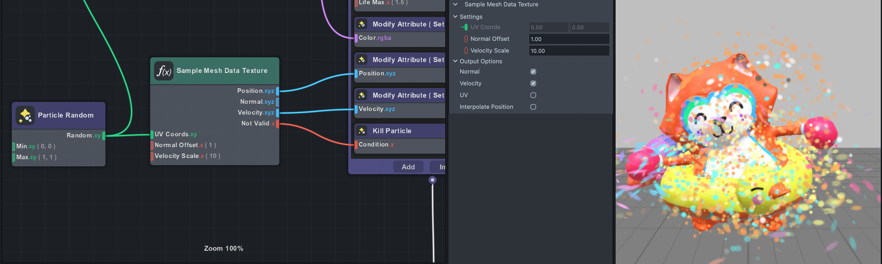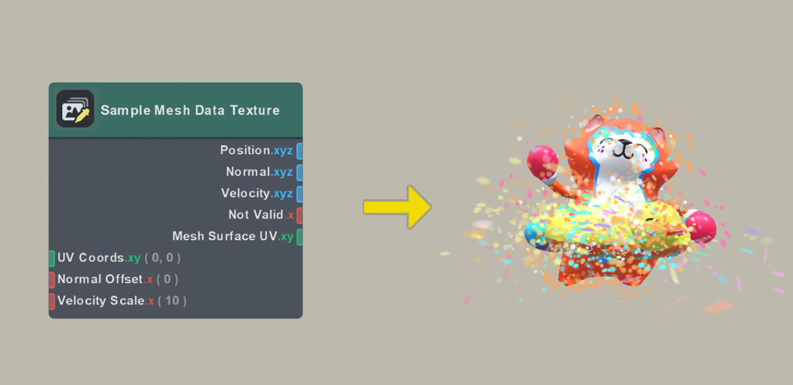 Mesh Data Texture is a powerful custom component can help you to create effects like particle spawning on meshes, scattering instances across surfaces, and more. It works seamlessly with both the VFX and Material editors, and provides access to the original mesh's normals, velocity and UV data. This unlocks many possibilities like setting geometry based on normal directions, inheriting velocity from animation, or create revealing effects using the UV data!