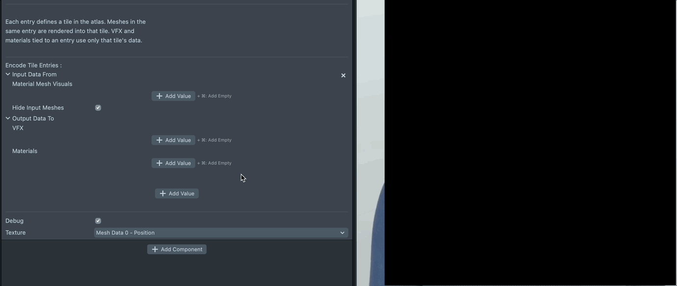 The atlas is always square, and its size automatically adjusts based on the number of mesh entry sets and the Per Tile Resolution setting. All of this happens seamlessly in the background, so you don’t need to worry about managing the layout. Debug mode can be enabled in the custom component to preview the encoded data if needed. This tile-based atlas structure ensures mesh data is organized efficiently and easy to access.