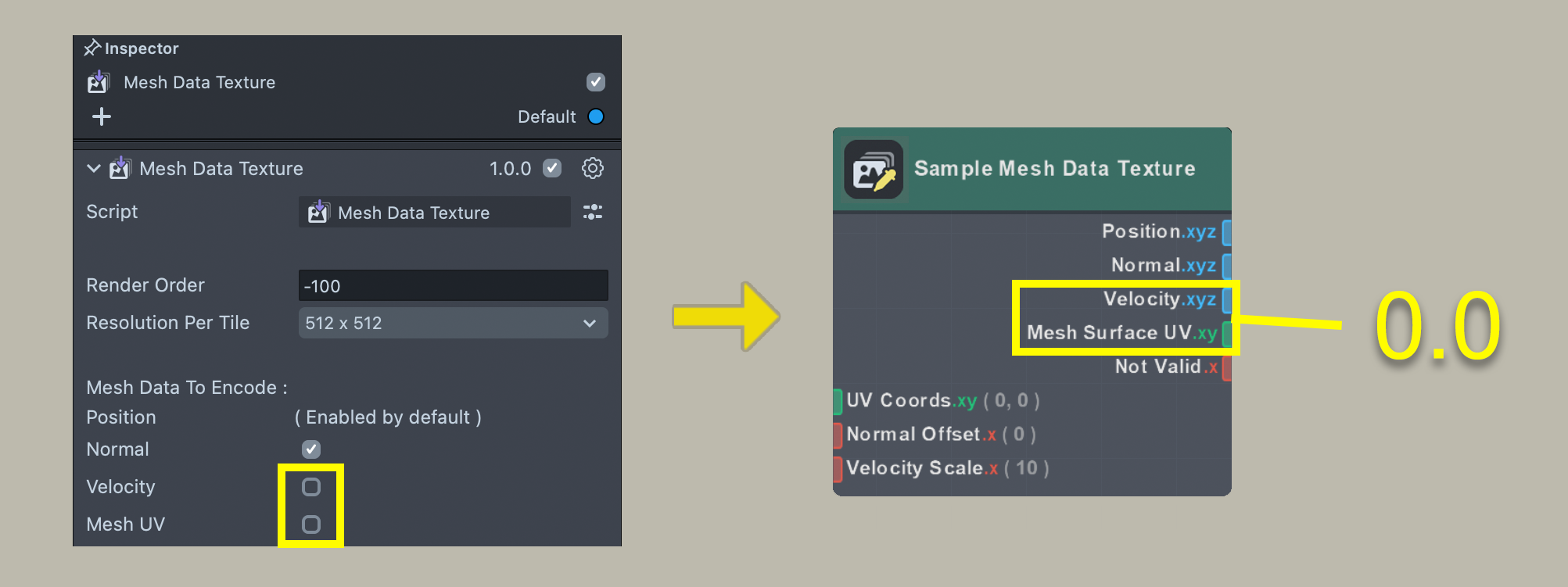 The Position attribute is always stored as default, you can optionally enable Normal, Velocity, and Mesh UV. When enabled, these attributes will be encoded for all tiles in the atlas. If an attribute is not enabled, sampling it in your graph will return zero. To verify which data is available, simply enable the Debug checkbox.