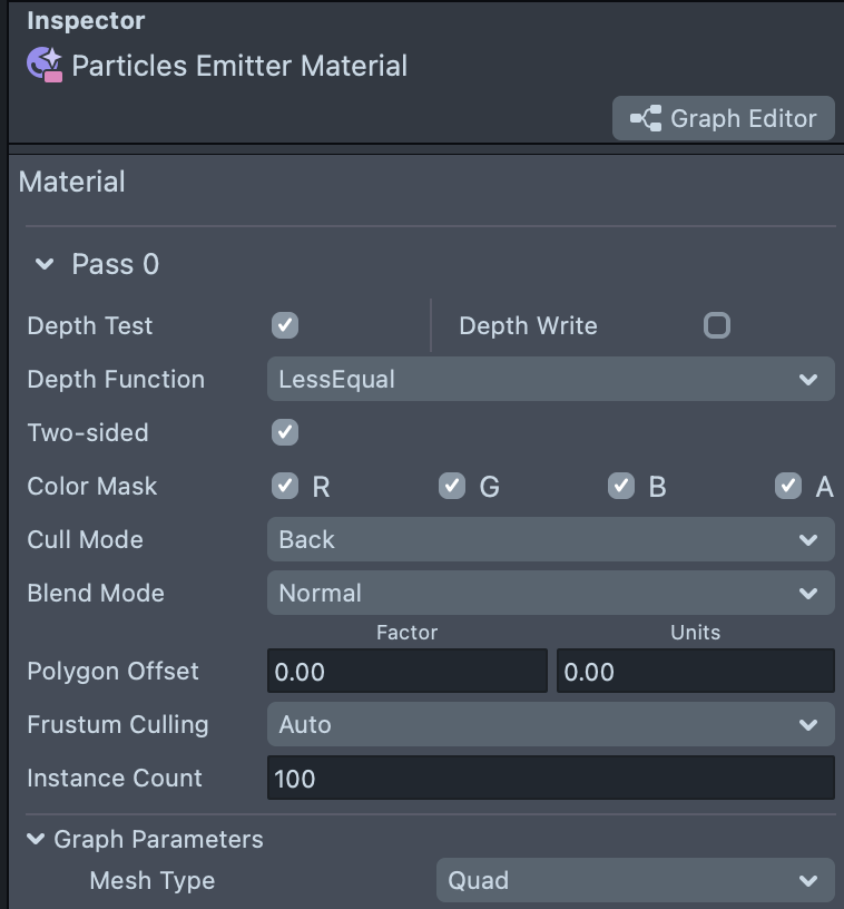 Quadis the default setting for Mesh Type. Quads are used to render 2D particles that face the camera. This is the most common type of particle, and is useful for effects that only need textures (like sparkles and snow). When using this mode, ensure that Double-Sided rendering is enabled and Depth Write is disabled.3D Meshallows you to render entire 3D objects as individual particles. This mode is useful for particles that benefit from complex rotation and lighting (like asteroids and crowds). When using this mode, make sure that Two-Sided rendering is disabled and Depth Write is enabled. Because this mode is rendering entire meshes with potentially thousands of vertices, it is more computationally expensive than Quad rendering.