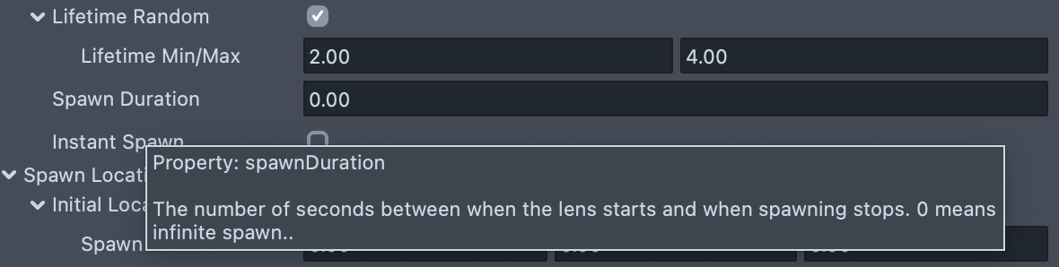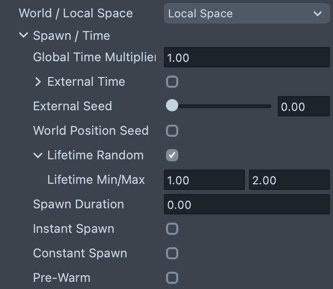 - Fade In / Out (vec2): (Trail Behavior = Match Head only) the amount of time it takes relative to the particle’s lifetime for particles to fade in (on birth) and out (on death). This fading is applied uniformly to the entire particle.