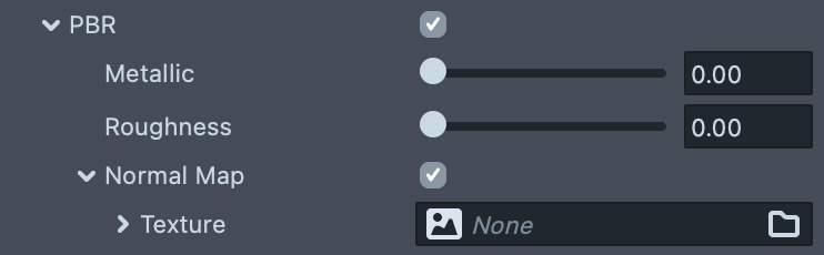 (3D Mesh only) PBR enables you to apply lighting to your materials. It also provides basic controls for metallic, roughness, and normals. For more information about PBR, check out the PBR (Lighting) Node Overview.