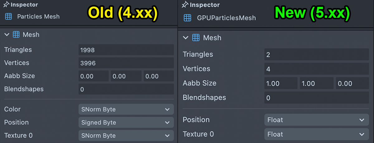When updating GPU Particles created in Lens Studio 4.xx, you will likely also have to update the Particle Mesh. This is because older versions of GPU Particles used a specialized mesh and had a limit of 1000 particles, while the current version uses a quad mesh and instancing to control particle count.
