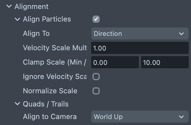 Alignment controls which direction particles face. By default, Quad particles face the camera, and 3D particles rotate freely in the world based on rotation settings.