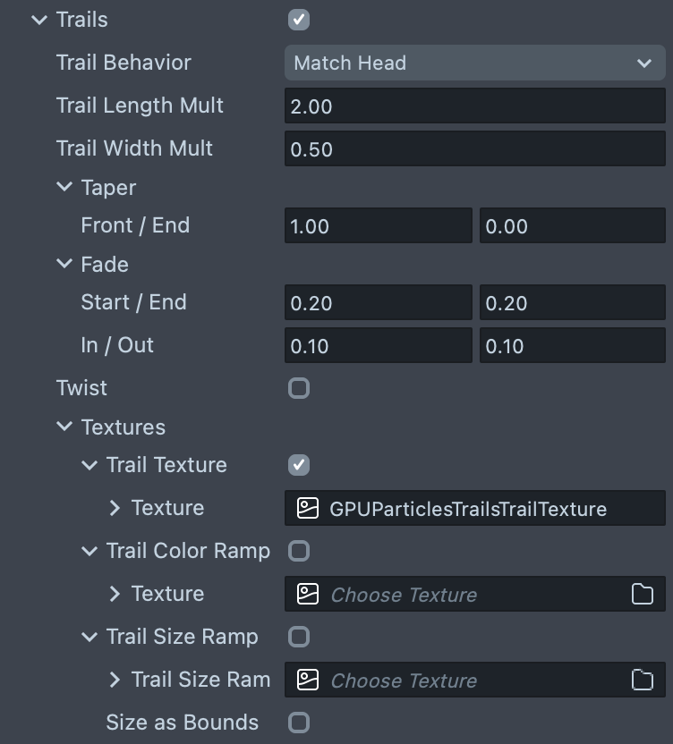 - Trails (bool): enables trail rendering. To properly render trails, you must use a specialized trail mesh in addition to enabling the