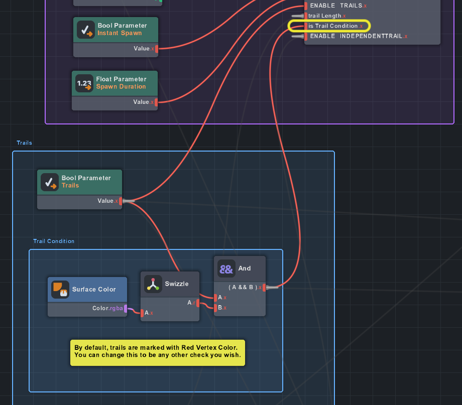 - Assign Red vertex color to the trail geometry. This tells the GPU Particles shader that this geometry is part of a trail.