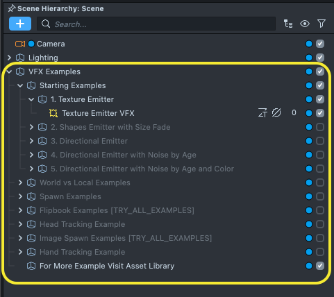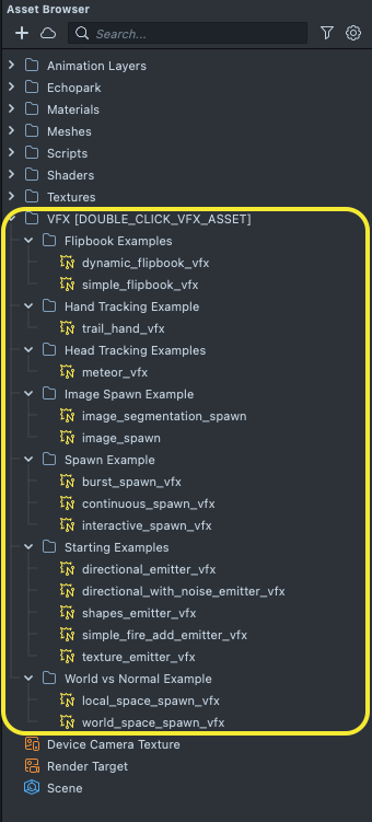 Each example contains an object which contains a VFX component with the related VFX asset. Same as the Material Editor, to see or modify the vfx in each example, take a look at the corresponding VFX asset in the Asset Browser panel. Then, double click on it to open it up in the VFX Editor panel.