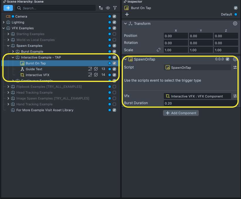 You can use the script component event to choose which event can trigger the code and makes the VFX to spawn the particles. For this example it is set to trigger on TapEvent but feel free to change it and make the spawn happening on other events.