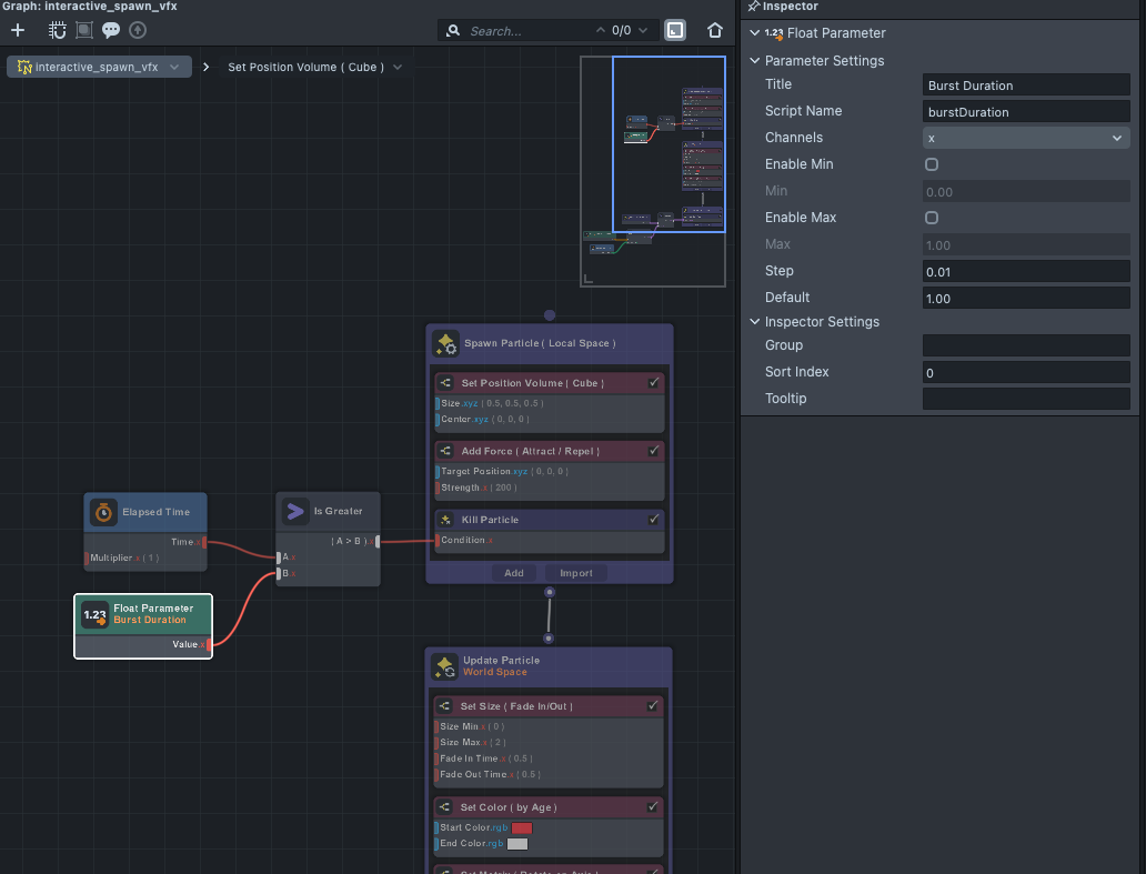 The above line in the script is how we are passing the current time with addition of our spawn duration to the burstDuration input in the VFX graph. Notice that this property matches the Script Name of the parameter in our vfx graph.