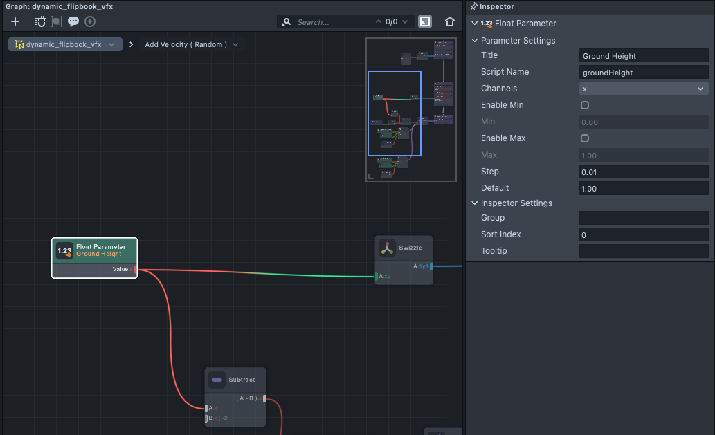 If we take a closer look at the dynamic_flipbook_vfx graph. We can see that we are specifying the ground height using the Ground Height parameter. This value can be customized in the Inspector panel to set where the position that if any particles reach that point the texture will change. You can see the logic in the image below
