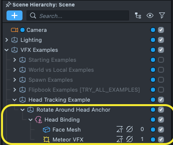 Rotate around the head example takes advantage of simulation space as well as head binding to attach VFX to a head. Also we use JavaScript code to duplicate one vfx and place it around the head. We will start by explaining the VFX and then we will talk about how to duplicate the VFX using JavaScript.