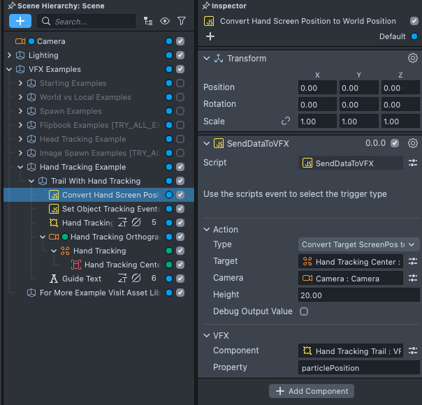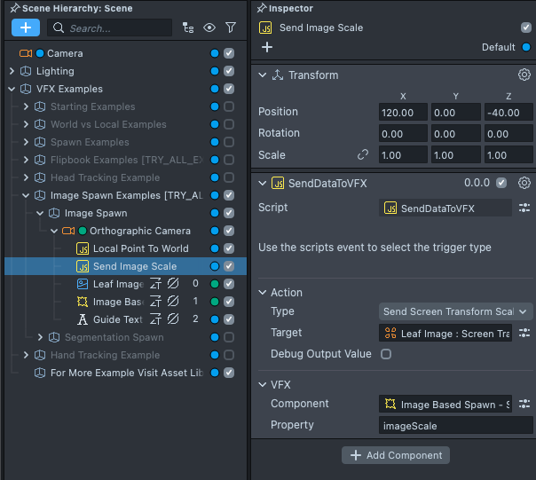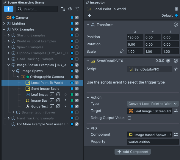 In this example we use this script two times to send two different values to the VFX asset. Once in Local Point To World, and another in Send Image Scale.