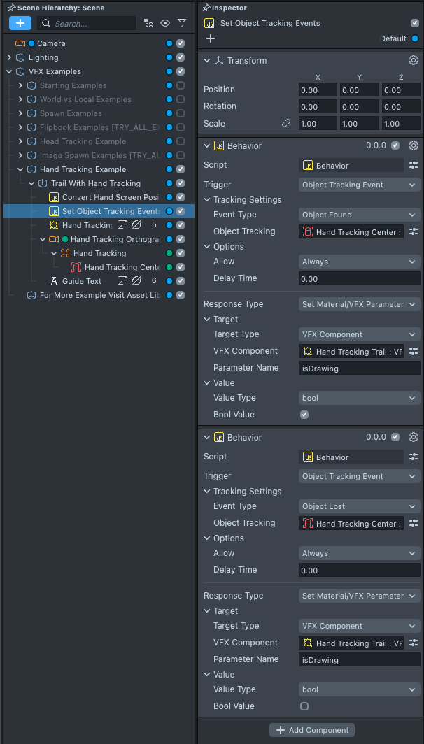 Since we want to spawn the particles only when the hand tracking is happening, we use a behavior script to tell the VFX if the hand tracking is detected or its not detected.