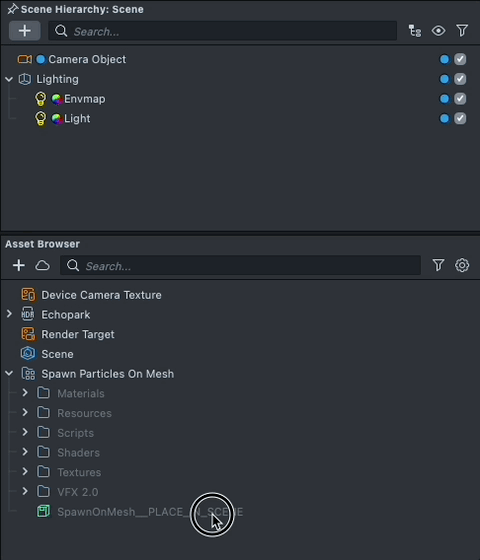 In the Asset Browser panel, open the Spawn Particles On Mesh object, and drag the SpawnOnMesh__PLACE_IN_SCENE into the Scene Hierarchy panel to add it into your Lens.