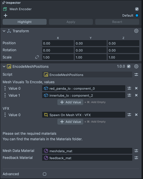 This example provides a helper script called EncodeMeshPositions which is responsible for reading the mesh data and passing it as a texture to the VFX.