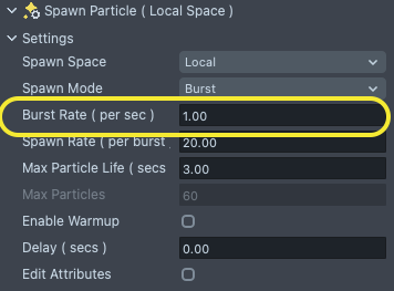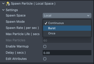Continuous spawn mode will spawn particles continuously but Burst mode will spawn particles every couple of seconds that can be modified in the Spawn container.