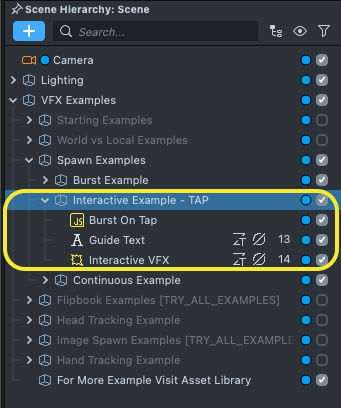 In the Scene Hierarchy panel, expand the Interactive Example - TAP object to see its children.