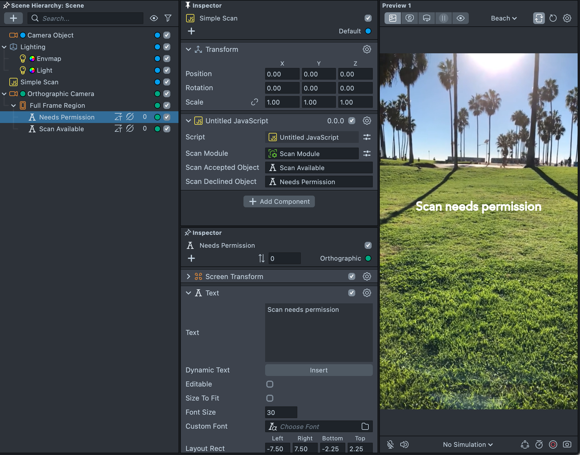 As an example, we can create 2 simple screens in Lens Studio, one will pop up when scan permission is accepted and another will pop up when permission is declined. We can add 2 references to the scan script we created earlier. We can input any objects into these 2 fields, for this demo we'll create 2 Screen Text objects, but feel free to use any custom design for official lenses!