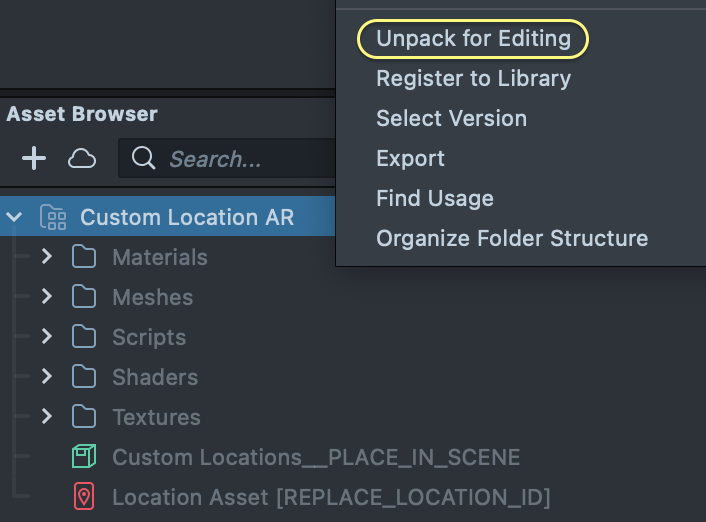 Once you import the asset from Asset Library, you can find the package in the Asset Browser. You can right-click and select Unpack for Editing from the drop-down menu to unpack all assets stored in the bundle. Click here to learn more about Asset Packages. Once you unpack the package, you can then edit its content.