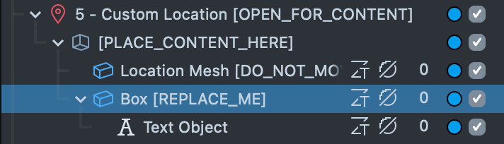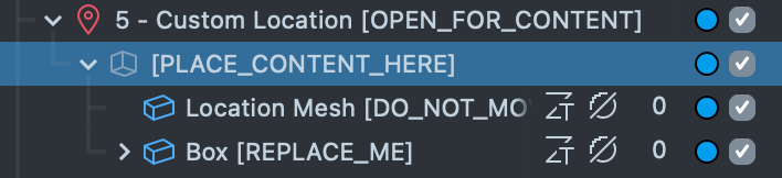 - Once your content is imported, Left-click and drag one of your assets and place it under the Custom Location [OPEN_FOR_CONTENT] -> [PLACE_CONTENT_HERE].