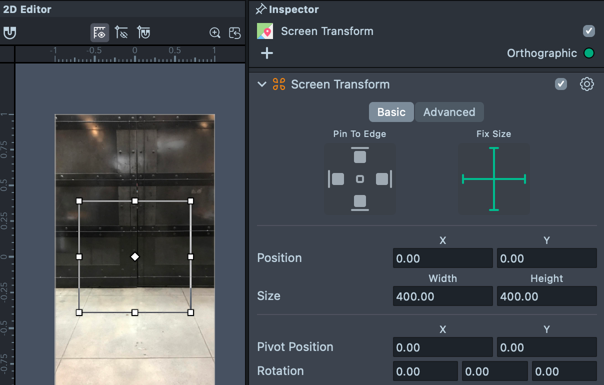 2D Editoror tweak screen transform settings in theInspectorpanel. For example, enable the Fix Size property to preserve the aspect of a map view.