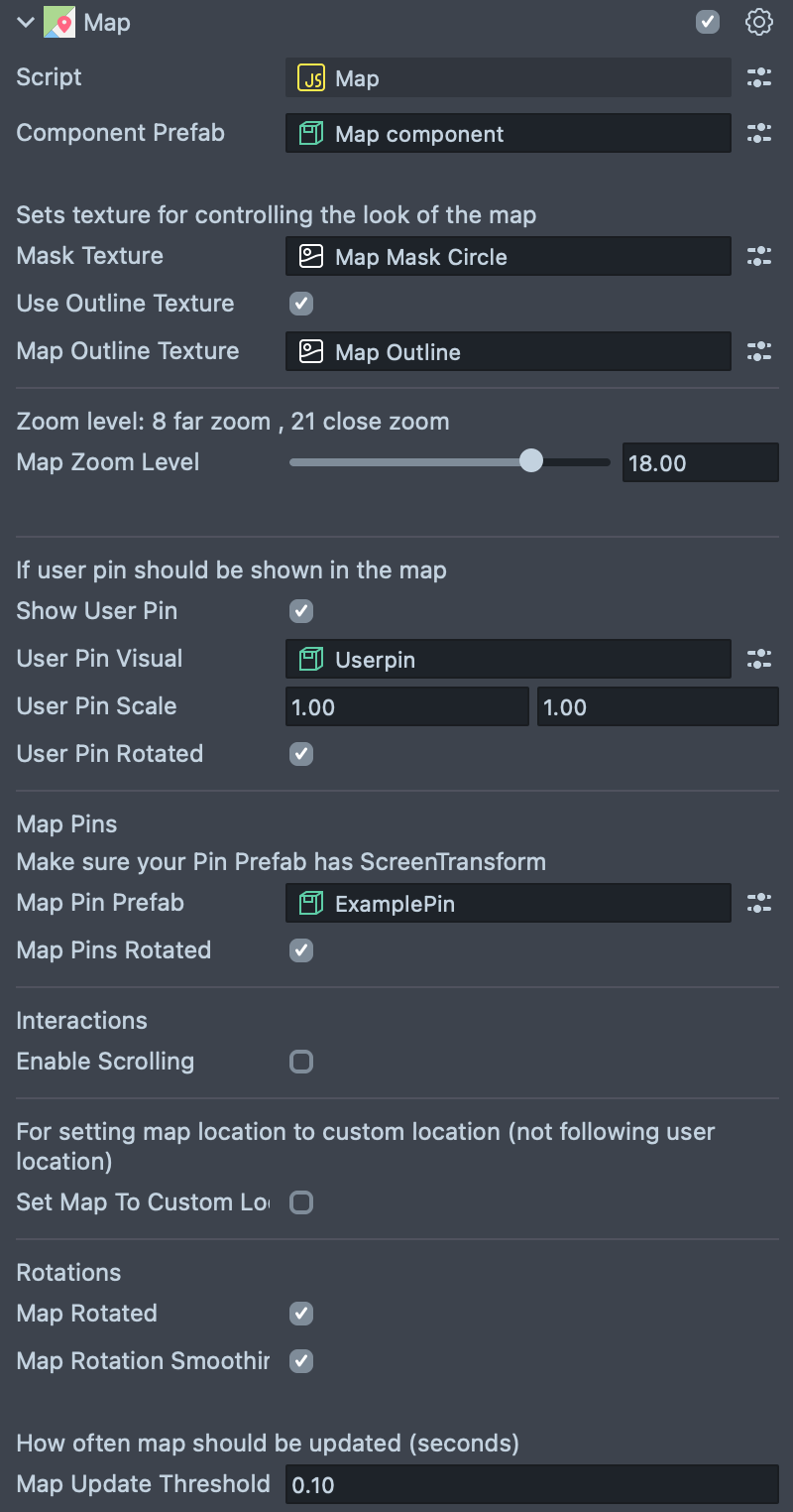 Map Component offers multiple different ways of customizing the map to fit different usecases. To customize your map click the Map scene object in the Scene hierachy and view the component in the Inspector Panel.
