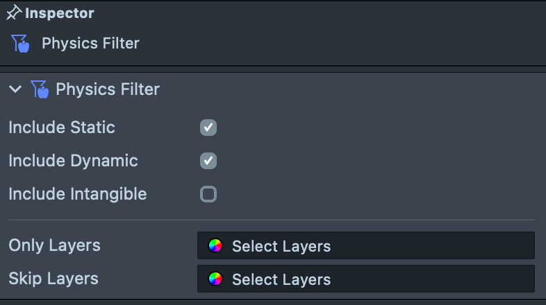 Physics Filter allows filtering by layer and to specific colliders. For detailed information about this component, check out the Physics Component guide section on Physics Filter.