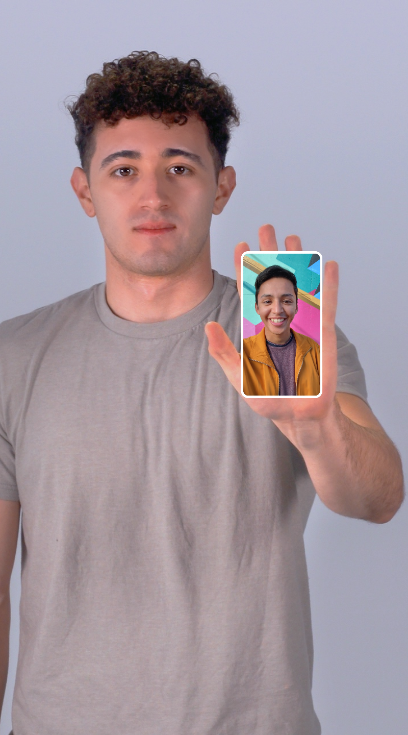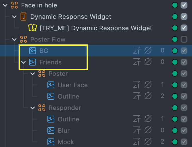 The Face in hole setup showcases a flow where the Poster’s and Responder’s faces are placed in placeholders on a customizable background. You can modify the BG and Friends images to change the background appearance.