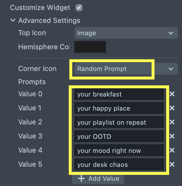 Background Options: You can set custom background's color or custom material.Prompt Text: You can customize the text color of the question and header. To make the text invisible, adjust the color's opacity to 0.Reply Button: If enabled, the widget will include a "Reply" button in the capture state (only for Poster).
