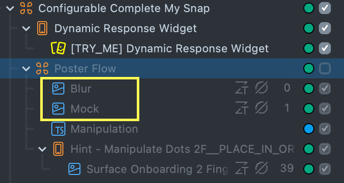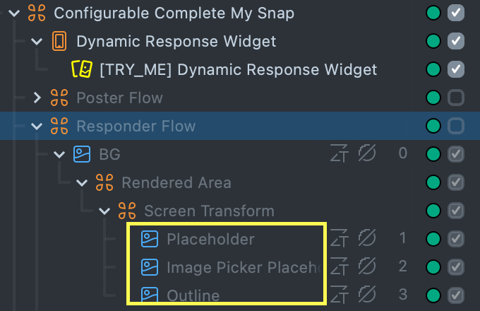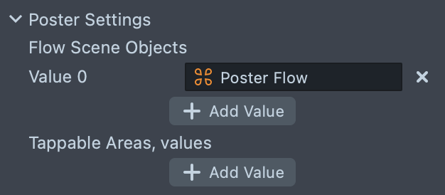 Flow Scene Objects- objects that will be enabled in Poster's state but disabled in Responder's.Tappable Areas- areas where the Responder can tap to enter the Lens. Each area contains a Screen Transform that identifying the region and also contain unique key. This key will allow you to identify the tappable area by with the Responder enters the Lens.