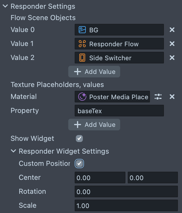 Flow Scene Objects- objects that will be enabled in Responder's state but disabled in Poster's.Texture Placeholders- placeholders for the Poster's Snap. Placeholder is a material and property name (baseTexby default).Show Widget- whether to show the widget for the Responder or not.Responder Widget Settings- custom center, rotation and scale of the widget that will be applied only for the Responder.