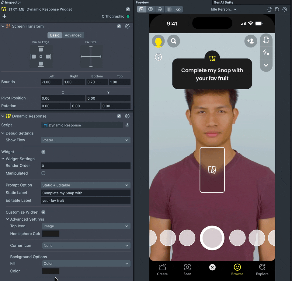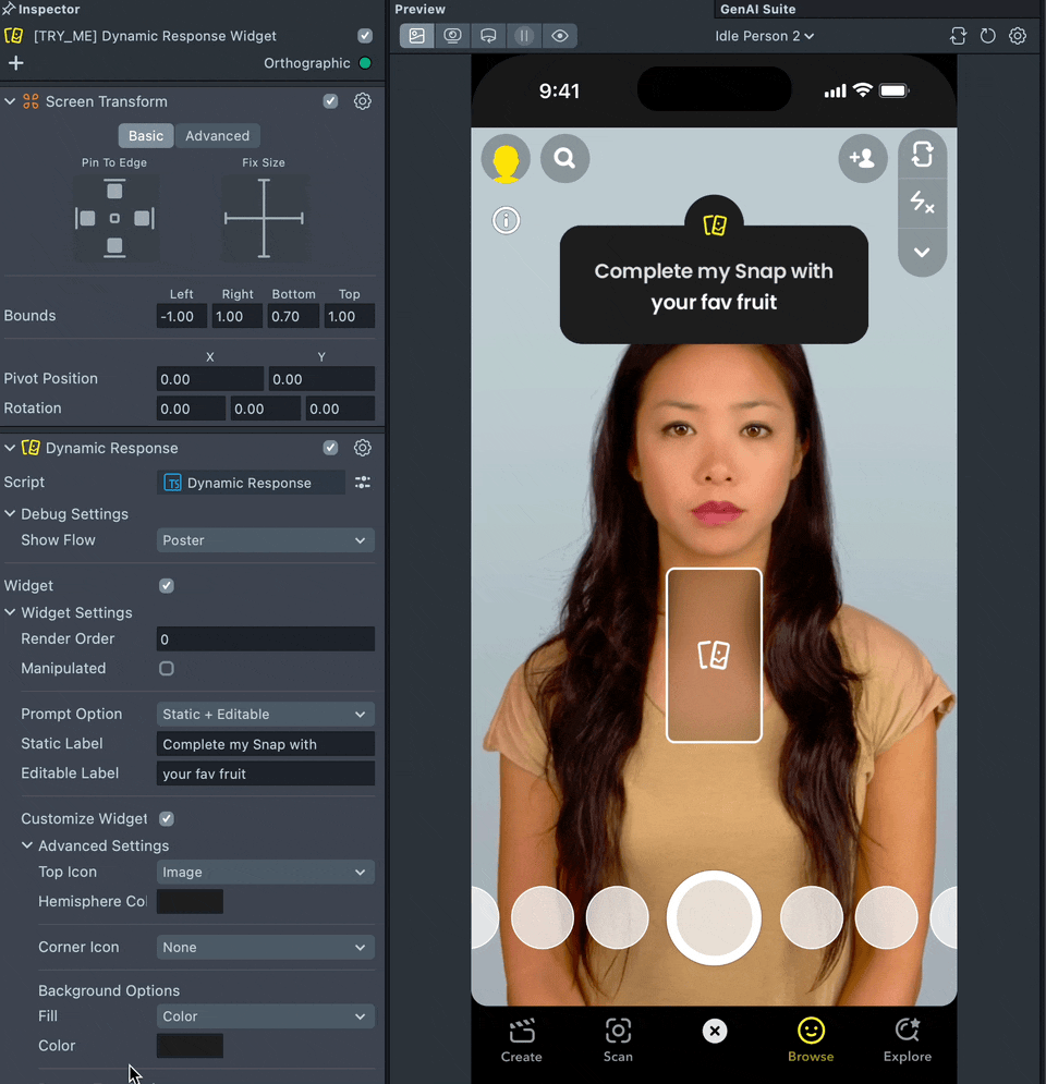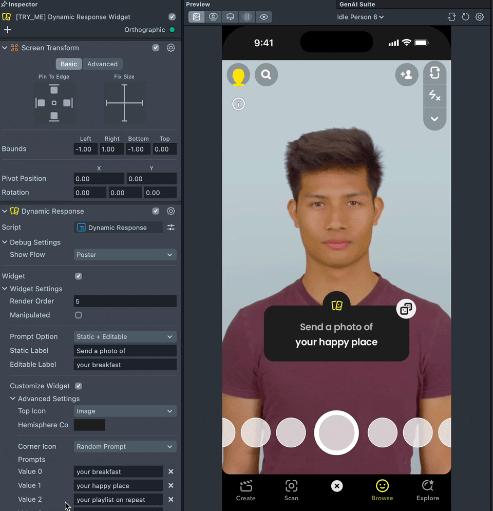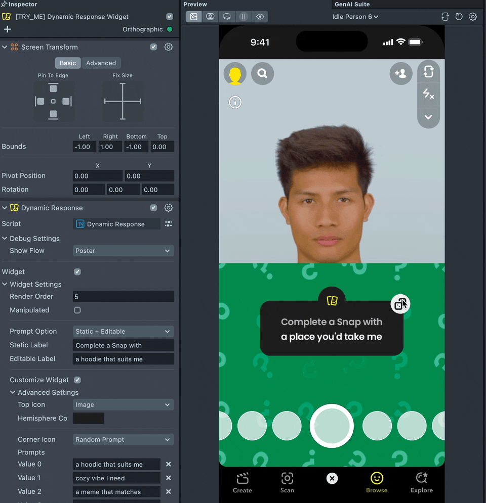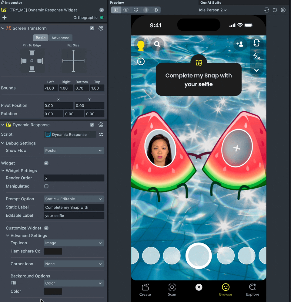 Dynamic Responsecustom component. Tappable areas can be added for the Snap and associated data to be transferred. - The Snapchat user opens the Lens, customizes it (e.g., modifies a widget), takes a Snap (image or video), and sends it to a friend or posts it to their Story.