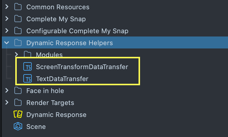 There are two helper scripts for the Dynamic Response component: ScreenTransformDataTransfer and TextDataTransfer. You can find them in the Dynamic Response Helpers folder in Resources.
