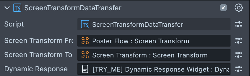 You can assign the Poster's Screen Transform to the ScreenTransformFrom input field and the Responder's Screen Transform to the ScreenTransformTo field. The script automatically gathers the Poster's screen transform data (position, scale, and rotation) and transfers it to the Responder flow.