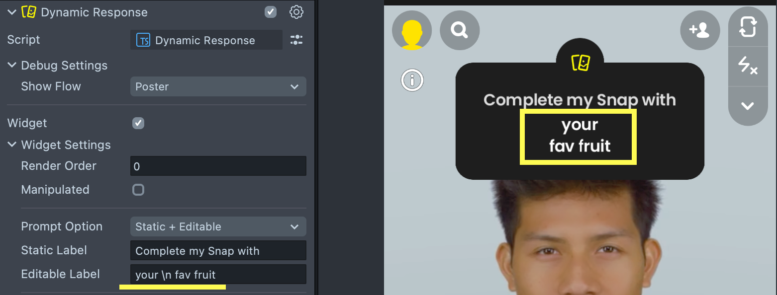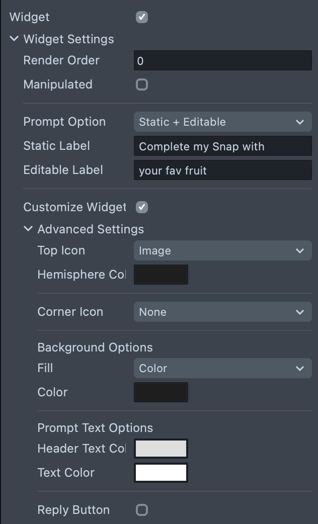 Manipulatedcheckbox: If enabled, the Snapchat user can move, scale and rotate the widget. If disabled, the widget is static.Prompt Option:Editable: The Snapchat user can tap on the prompt text and change it.Static: The text cannot be modified by tapping.Static + Editable: One line of the text (header) is static, and the others are editable.