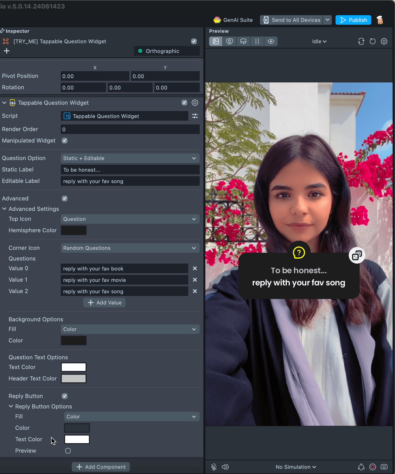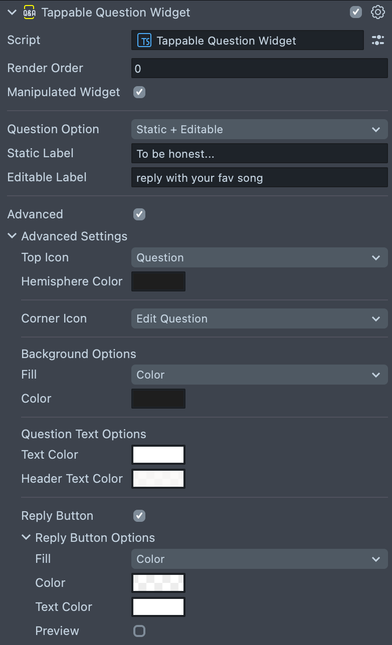 • Reply Button Options: You can adjust the button's color or material and change the button's text color. To see how the widget will look, enable the Preview checkbox.