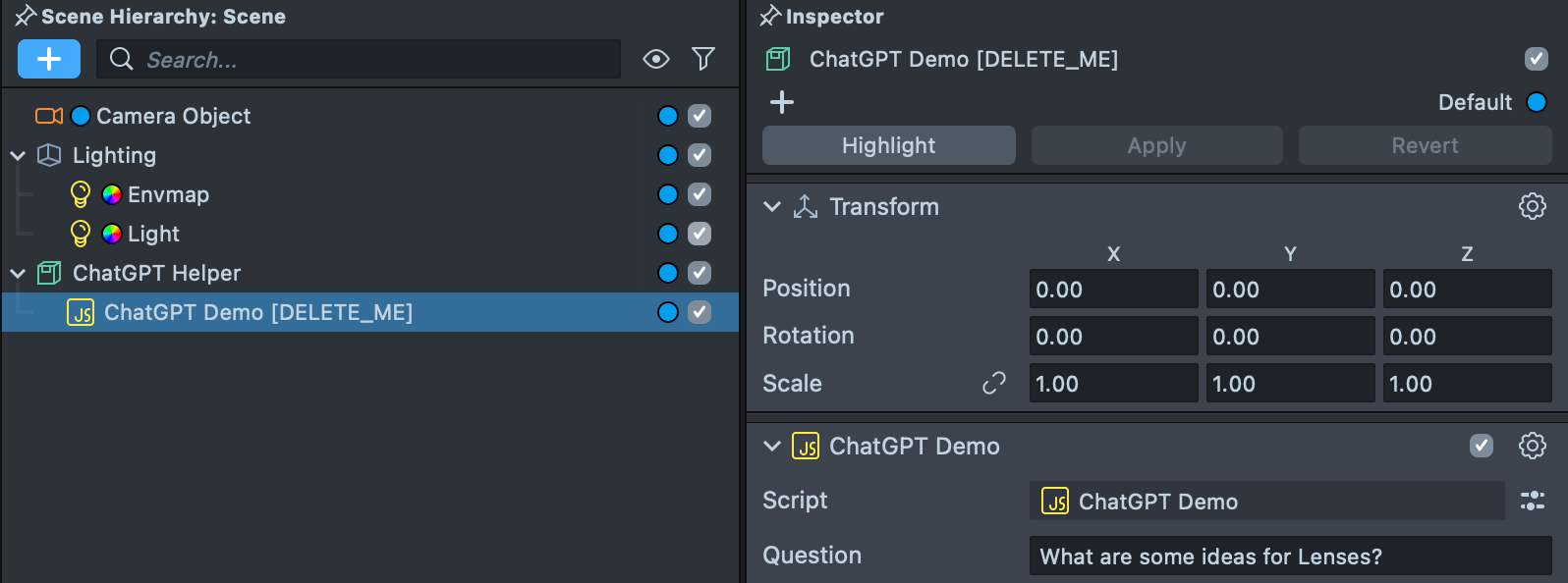 With the ChatGPT Demo object selected, you can change the question to ChatGPT in the Inspector panel. Tap the Preview panel to run the query.