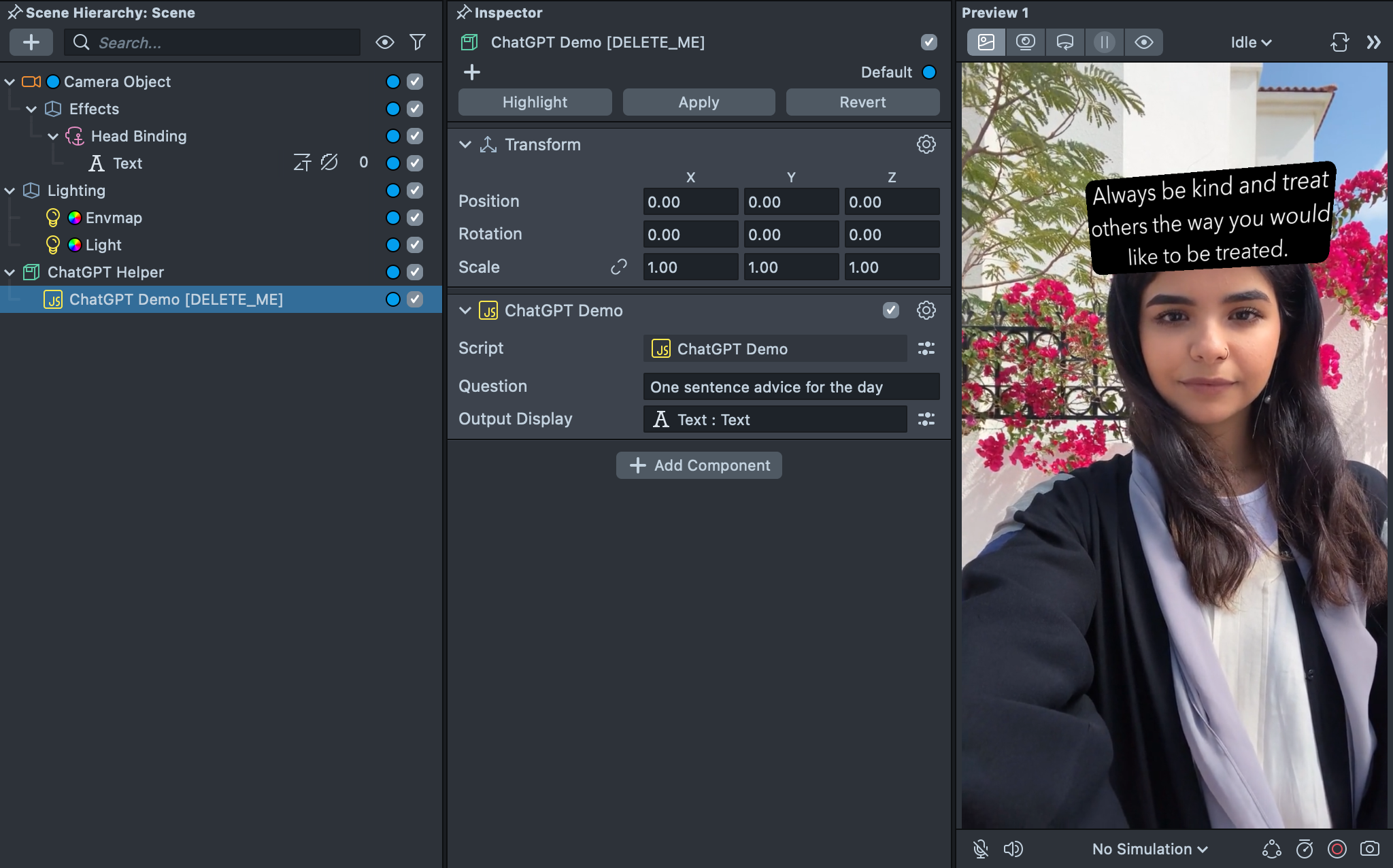 Tap to get adviceas the text in our text component. - Lastly, in the ChatGPT Demo script, you can increase the