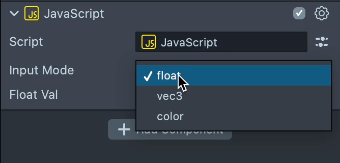 //@input string inputMode {"widget":"combobox", "values":[{"label":"float", "value":"float"}, {"label":"vec3", "value":"vec3"}, {"label":"color", "value":"color"}]}