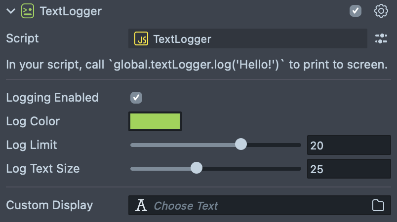 Text Logger Modulewhich contains the core functions of the Text Logger, which the Custom Component wraps around. This is mostly useful to customize the text logger to your need, or if you only need to call the text logger from one script.