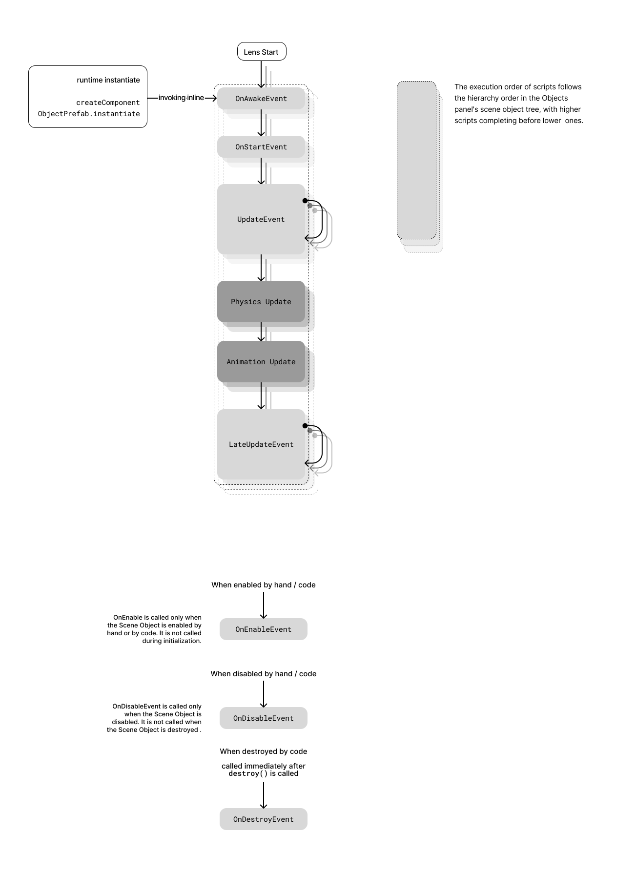These events are tied to the timing and execution of the Lens Scene. The ordering in which the scene objects are placed in the scene hierarchy will determine the execution time.